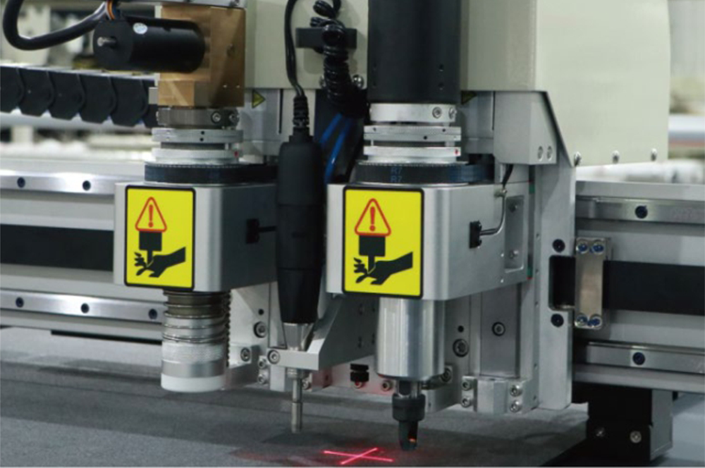機頭上配置雙刀+筆繪 / 鉆孔,根據不同行業, 自由切換刀具組合,滿足復雜多變的切割工藝。